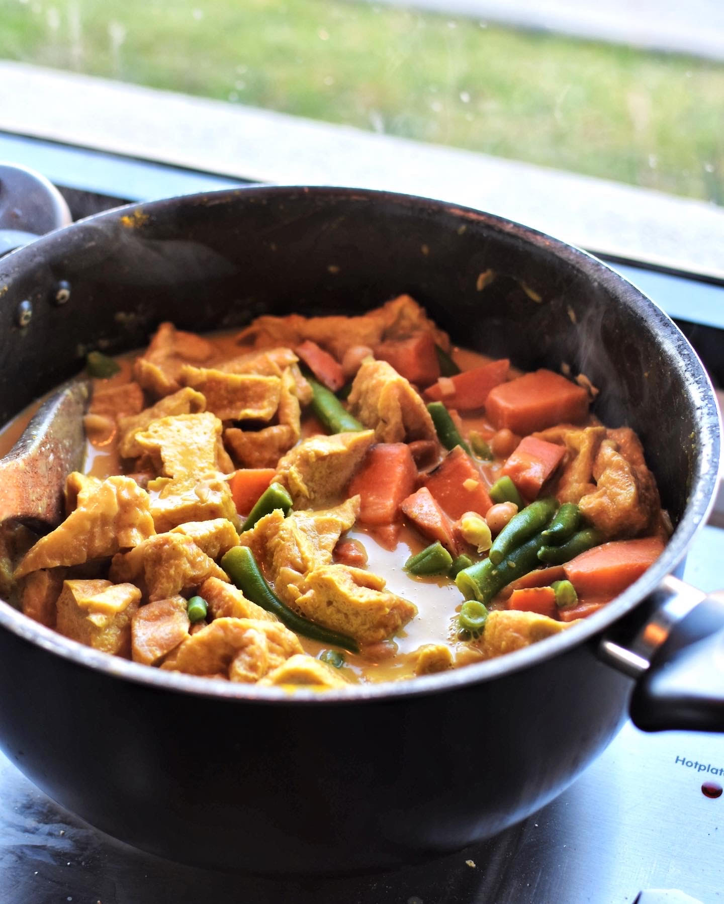 3. Add the puffed tofu, drained chickpeas and green beans. Mix well. Taste the curry sauce and add more flavouring if desired.