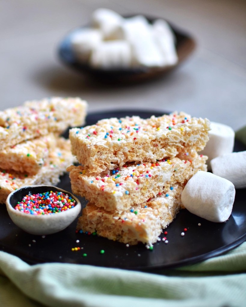These bars use minimal ingredients and are my version of LCM bars in Australia or Rice Krispie Treats in the US. I used half a bag of vegan Dandies marshmallows, but you can use the whole bag or even 3/4 of the bag for more chewiness and just add more rice bubbles. The ratios that I used create a delightfully sweet and slightly crunchy bar with bits of chewiness.