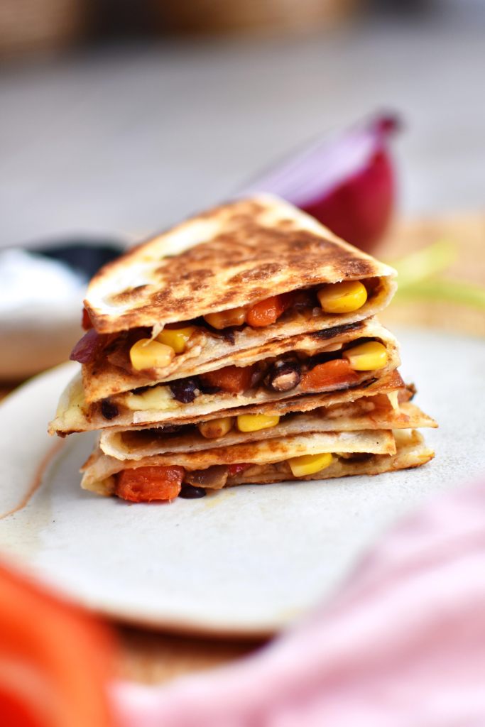- On a frying pan on medium heat, place a tortilla in the centre. On one side, sprinkle on vegan cheese, veggie mixture and then vegan cheese on top. With a spatula, fold the tortilla in half and press down. Leave for up to a minute.
