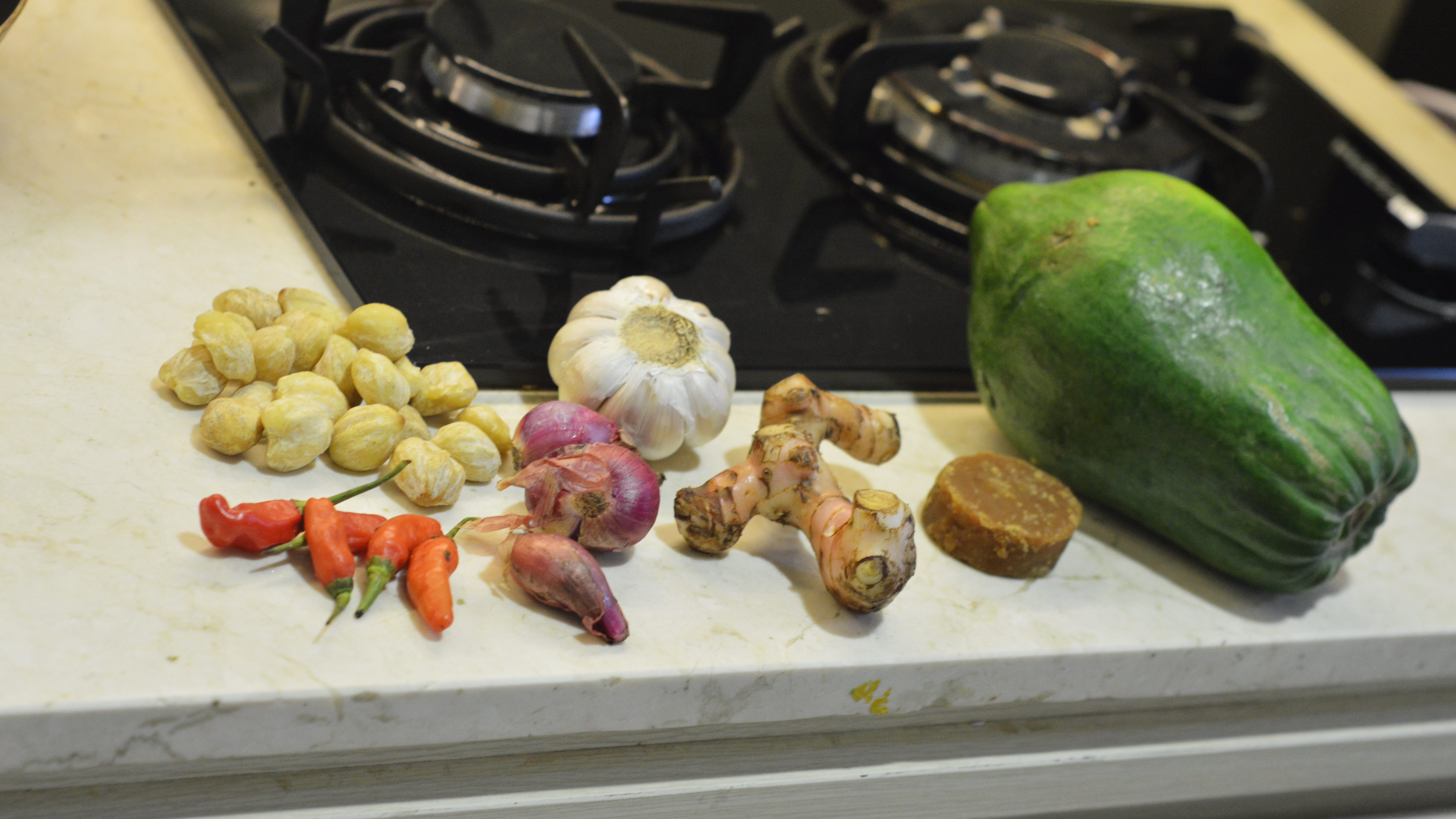 I also bought all the ingredients for stir-fried green papaya here. I bought galangal, garlic, shallots, a whole green papaya (you can find pre sliced green papaya which will make it a lot easier), red chilli, candlenuts, Javanese sugar (gula jawa), various packages of tempeh and a small bottle of kecap manis sauce. The one thing that frustrates me is the use of plastic for basically everything in Indonesia. Back in Australia, sustainability is a big focus with people bringing their own bags. In the market, literally everything was packaged in plastic, from the garlic, chilli, galangal… if you are plastic conscious, you will need to tell them directly that you don’t want to use a plastic bag. If you see them starting to package the smallest thing in plastic, you can say: ‘ga usah pake plastik’ – all phonetic, which means ‘no need to use plastic’.