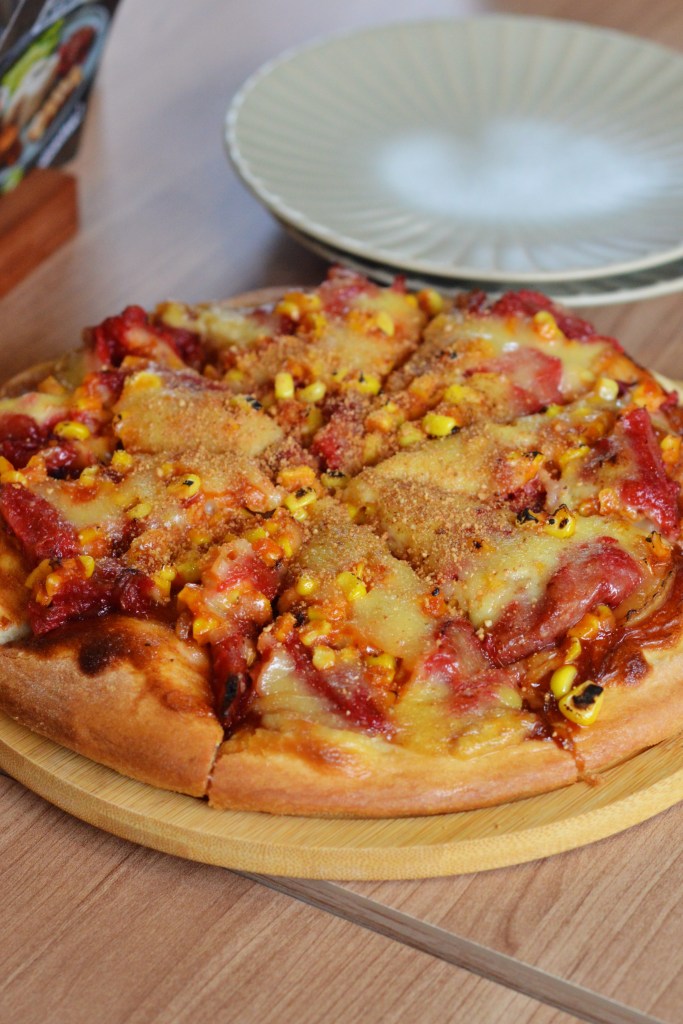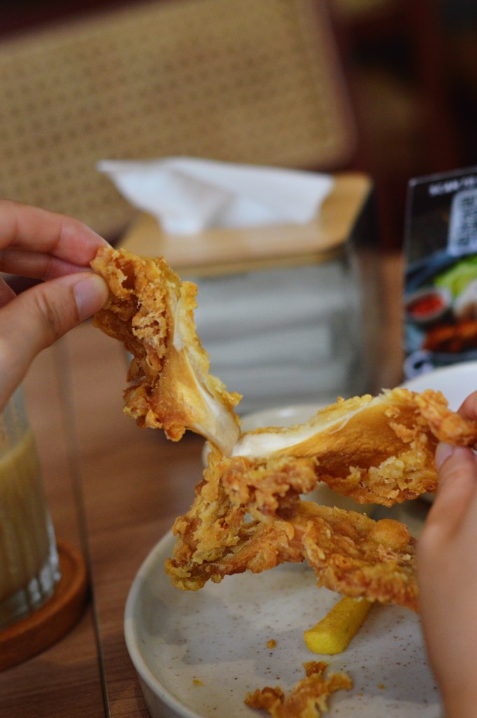 This calm cafe is located in Serpong, which is southwest of central Jakarta. This area has a lot of vegetarian Chinese restaurants and cafes as there is more of a demand for vegetarian cuisine here. They have quite a selection of western style food, which I often do crave in Indonesia to get a sense of home again. This pizza was such a delicious mix of toppings, including corn, a gooey and rich vegan cheese and vegan cha siu (Chinese BBQ pork) and this drink was a gula aren latte, which is made from a special kind of dark sugar with coffee. The sugar has a rich, caramel-like taste which was a divine pairing with the iced coffee. I also tried the Kentucky fried shrooms, served with chips. The texture of oyster mushroom is perfect for creating that crunchy and meaty texture. It was tasty but I would have liked a bit more of a flavourful seasoning on it.