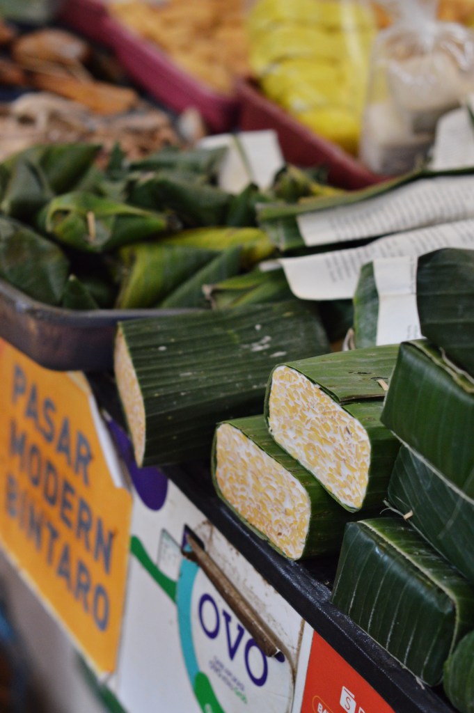 I stayed in a small apartment in Bintaro, Jakarta and wanted to try buying groceries and cooking in Indonesia as if I was living there. We went to a tradition style market called Pasar Modern that was really close by, which means Modern Market and found an abundance of fresh vegetables and I was in awe of the freshest tempeh I’ve ever seen. If you’ve only seen tempeh in Australia or other countries, tempeh at the market might catch you by surprise. They are wrapped in a banana leaf and sometimes some newspaper. They come in all shapes, like a block, small rectangle or pyramid.