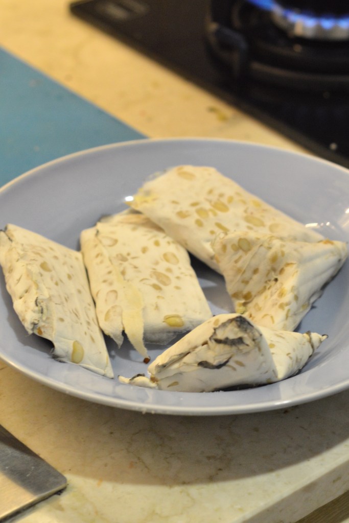 When I unwrapped the tempeh and touched it, it’s nothing like I’ve ever felt. It feels like a cobwebby vibe on the surface and there’s black bits on it. I made sure I gave it a good rinse as sometimes small bugs make their way onto the tempeh while at the market. I picked off the black bits too, just in case. Indonesians love to deep fry their food, and tempeh is no exception. My Indonesian boyfriend Yayan (who once claimed that he didn’t know how to cook) showed me how he scores the tempeh and then places it into salty water before deep frying it until it turns golden brown.