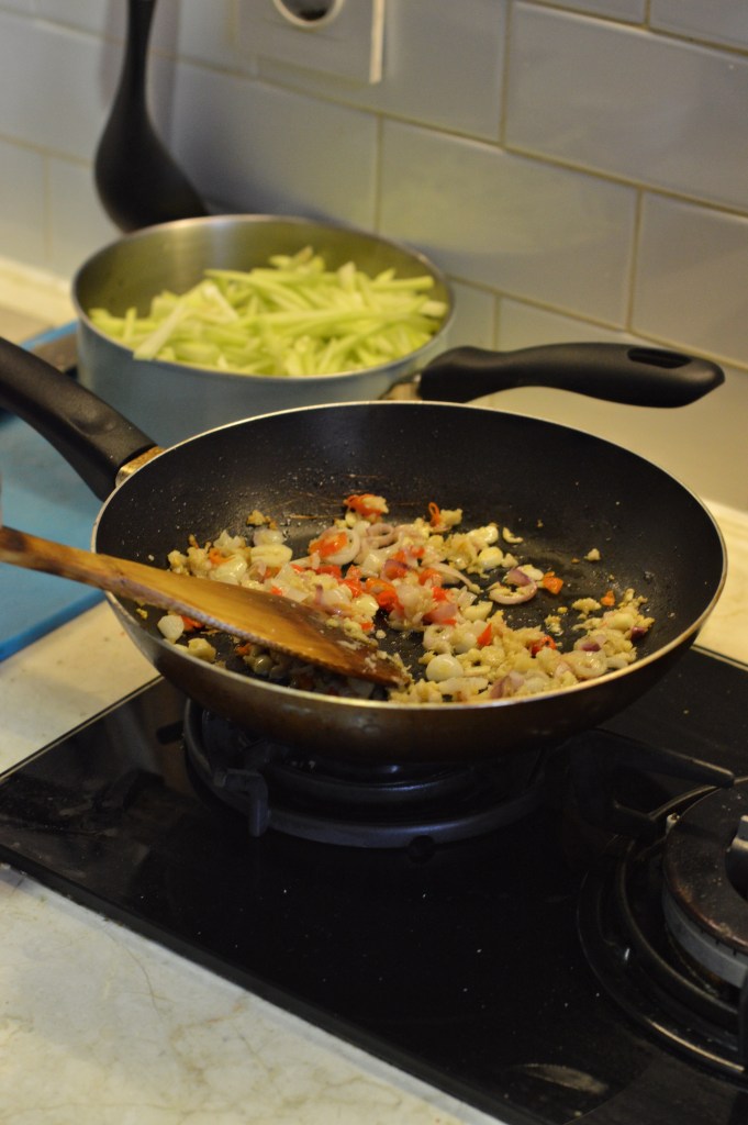 I wanted to cook something Indonesian in the spirit of being here that also didn’t need much bench space. Ripe papaya is yellow, sweet and soft, but young papaya is green, hard and lacks much flavour on its own. I followed a general recipe I found online. Cutting the papaya was the most tedious, and as soon as you cut it, a sticky white sap-like liquid starts seeping out and makes your fingers tacky. The recipe said to grate it, but our apartment didn’t include a grater, so I just peeled the outside skin and sliced the papaya into strips.
